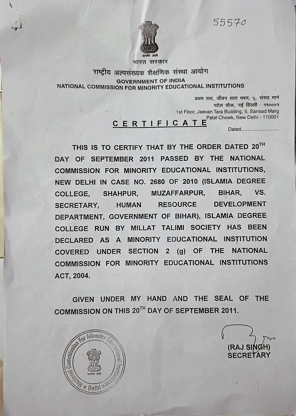 Certificate Of Millat Talimi Society - Click Here